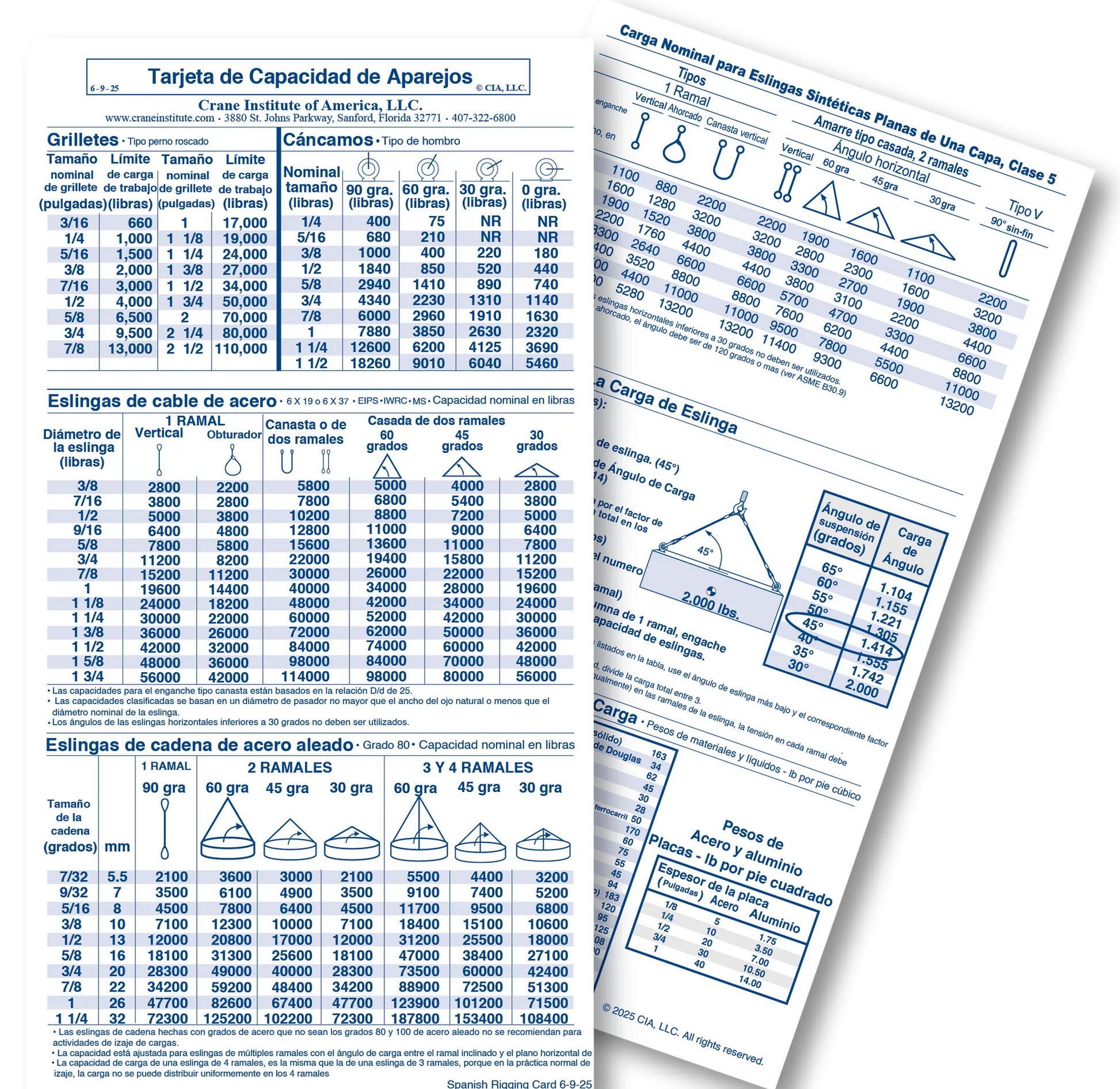 Laminada y resistente al clima. Esta tarjeta plegable de tamaño cartera contiene información sobre las capacidades de cáncamos, grilletes, cables de acero, cadenas y eslingas de cinta sintética. Incluye el peso de los materiales más comunes en las obras y un ejemplo paso a paso para calcular la carga de la eslinga.